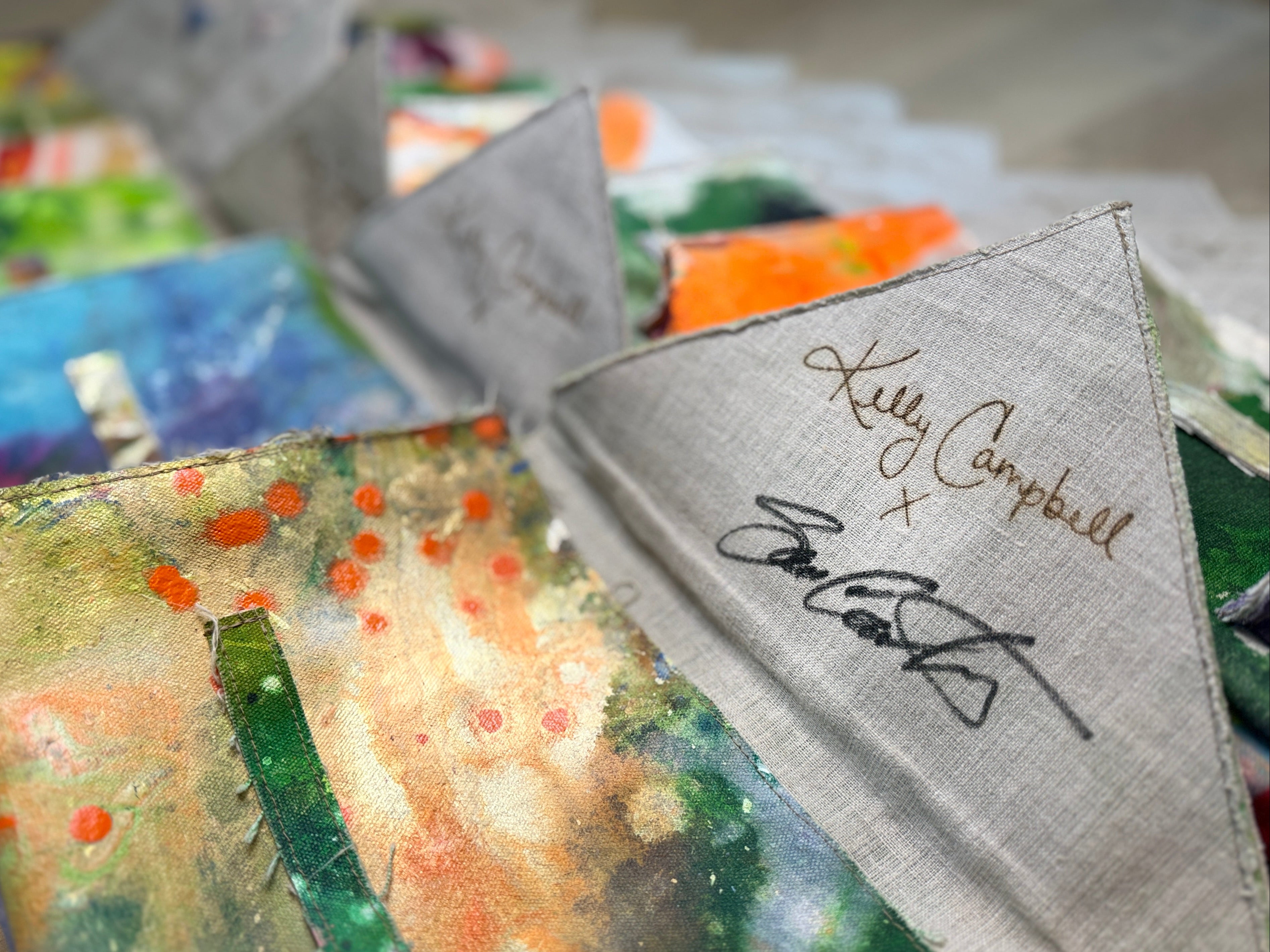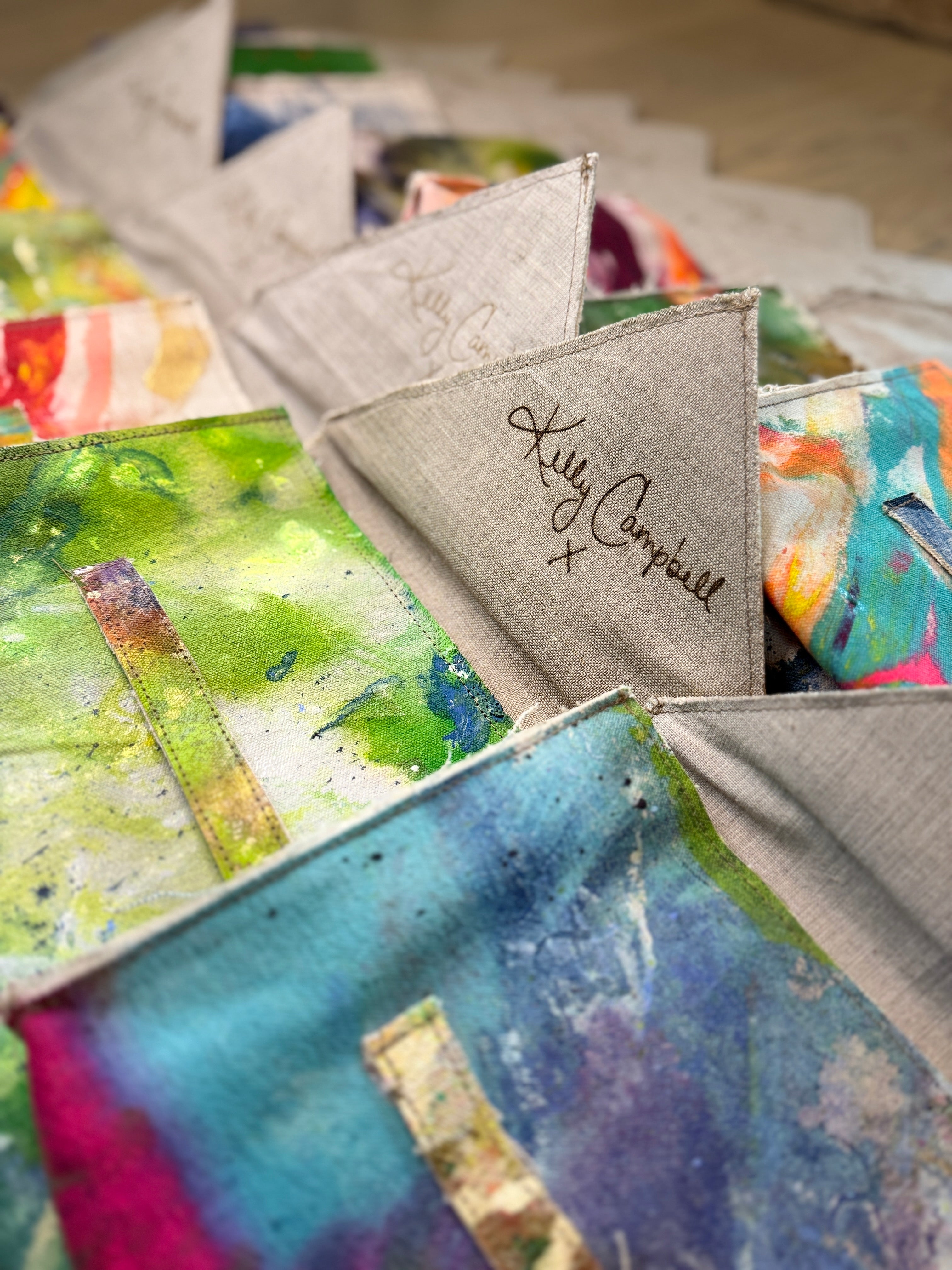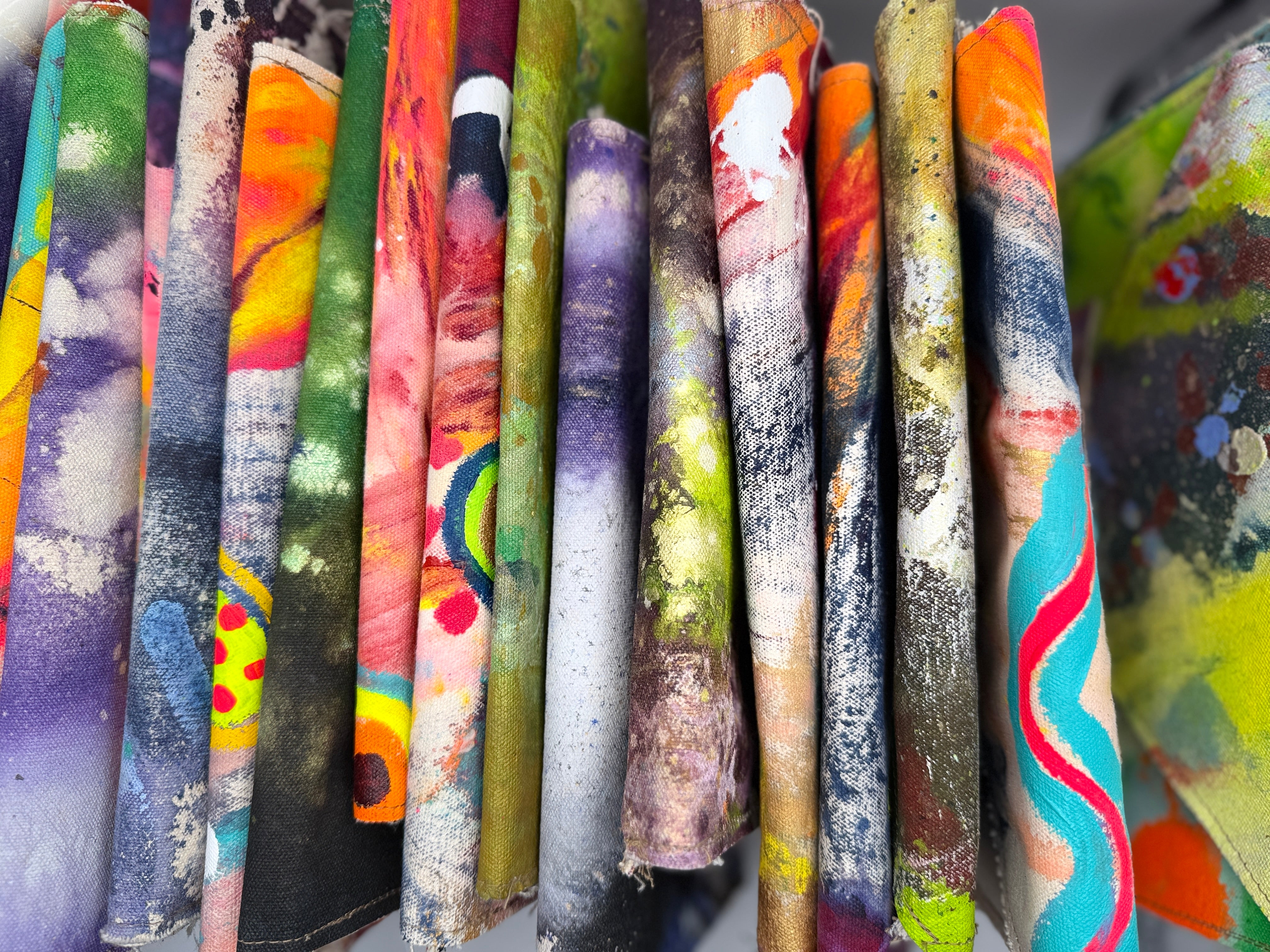 What begins as a working canvas in an artist’s studio — absorbing brushstrokes, color tests, and traces of creation — becomes a hand-crafted, one-of-a-kind bag.